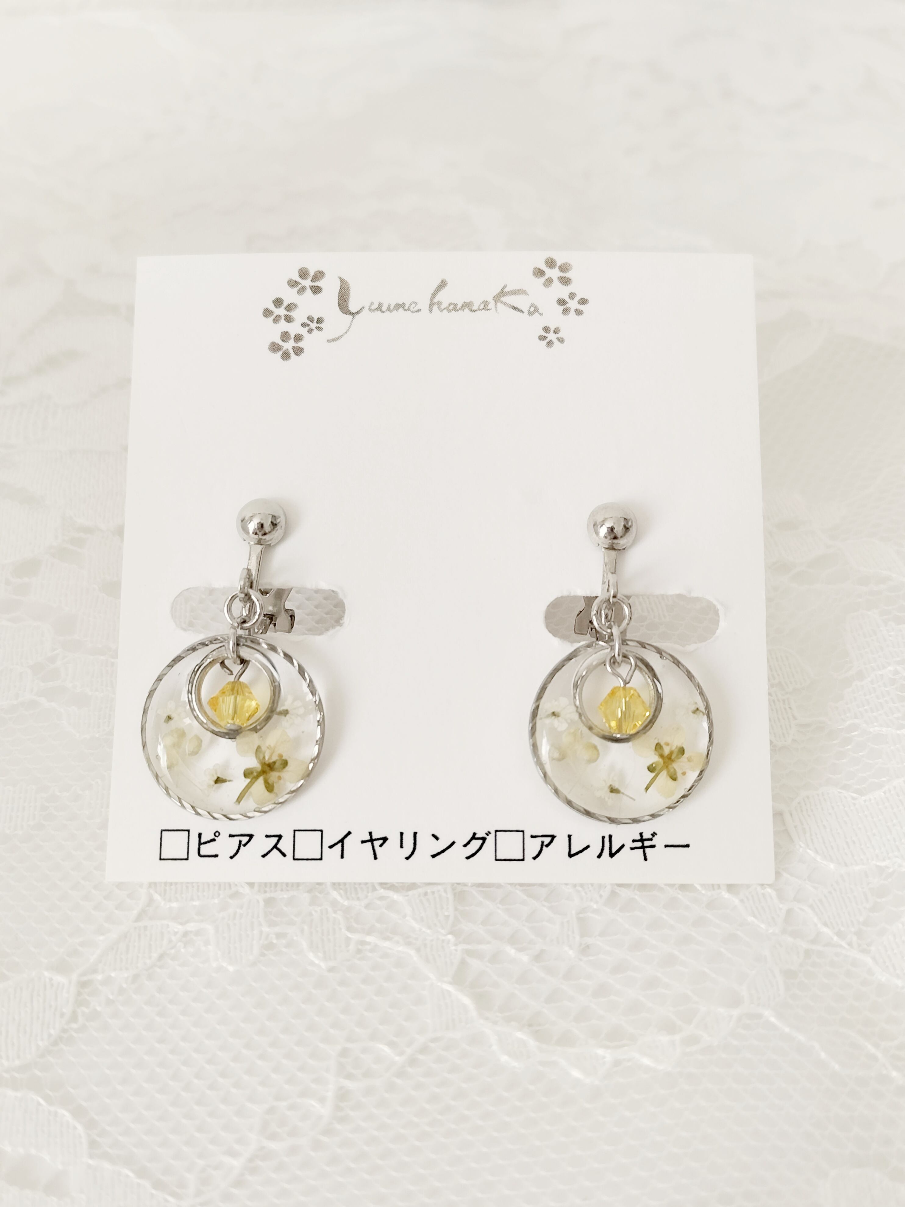 レジン(樹脂)、押し花(レースフラワー、ソフトカスミ草、アリッサム)、クリスタルガラス